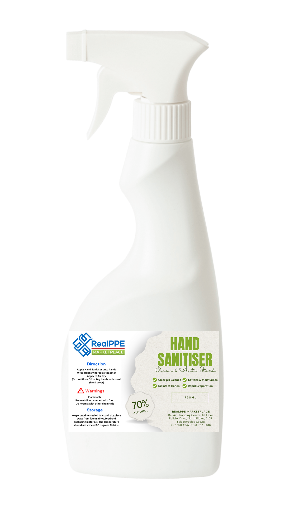 - 750ml Spray Bottle: A portable and convenient option for on-the-go sanitisation. Keep it in your car, purse, or backpack for easy access throughout the day.
